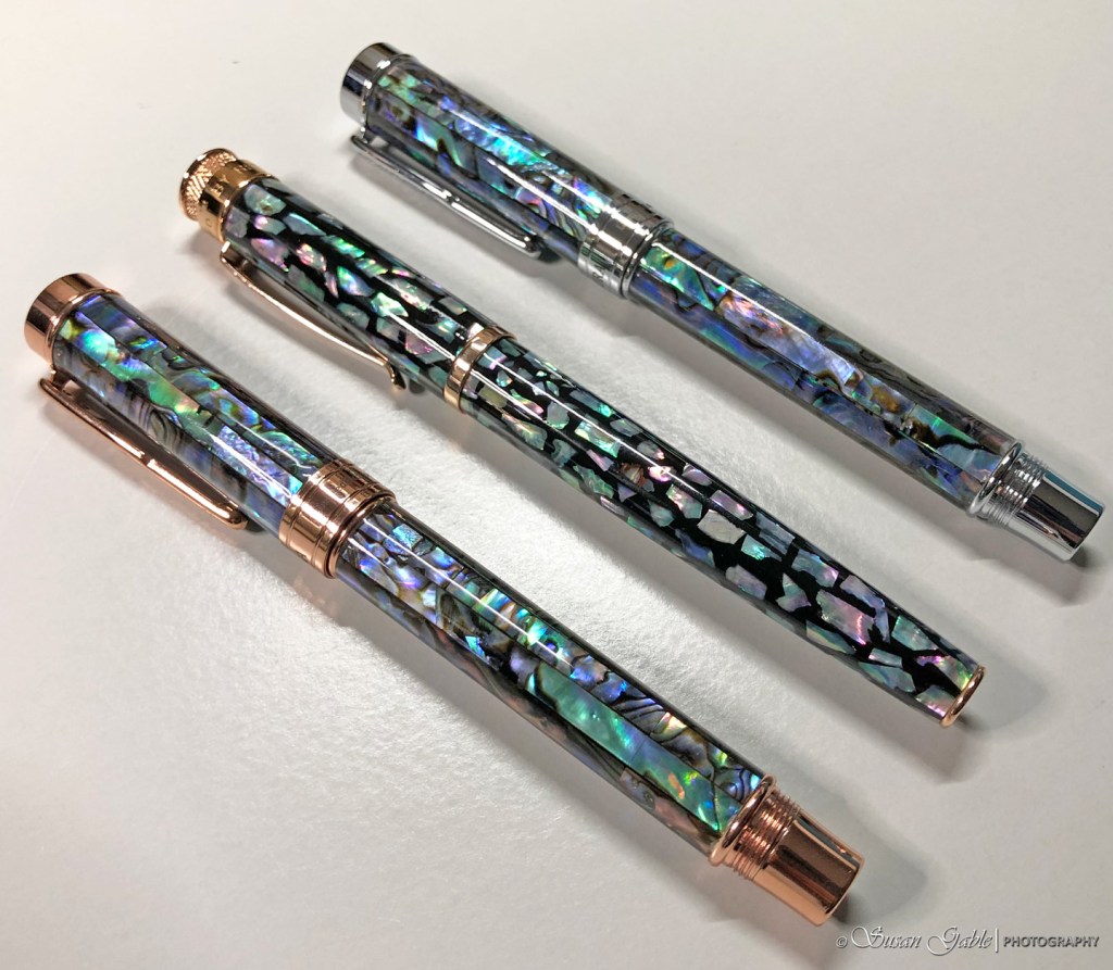 I had my eye on another abalone pen that kept popping up on several social media sites. This one was made by Laban. Abalone trimmed with polished chrome or matte gunmetal. Beautiful pen! I had not paid too much attention to this brand other than seeing their table at the local pen show. Their abalone pen ended up on my wishlist. Over time, that pen kept getting pushed further down on my list. More than likely because of the price. In that price range, I expect to see at least a 14K/585 gold nib on a pen. I know it’s because of the gorgeous abalone, but I still expect to see a gold nib and not gold plated. That’s just me.