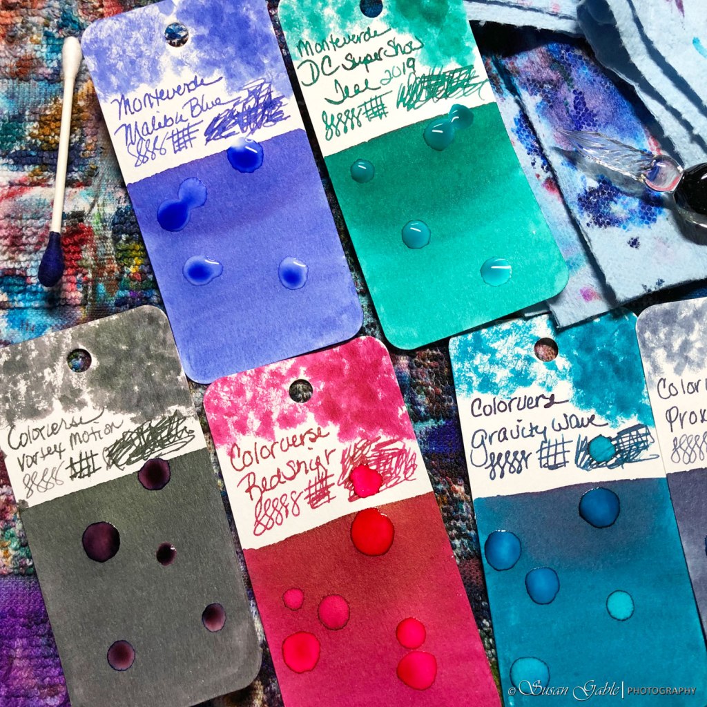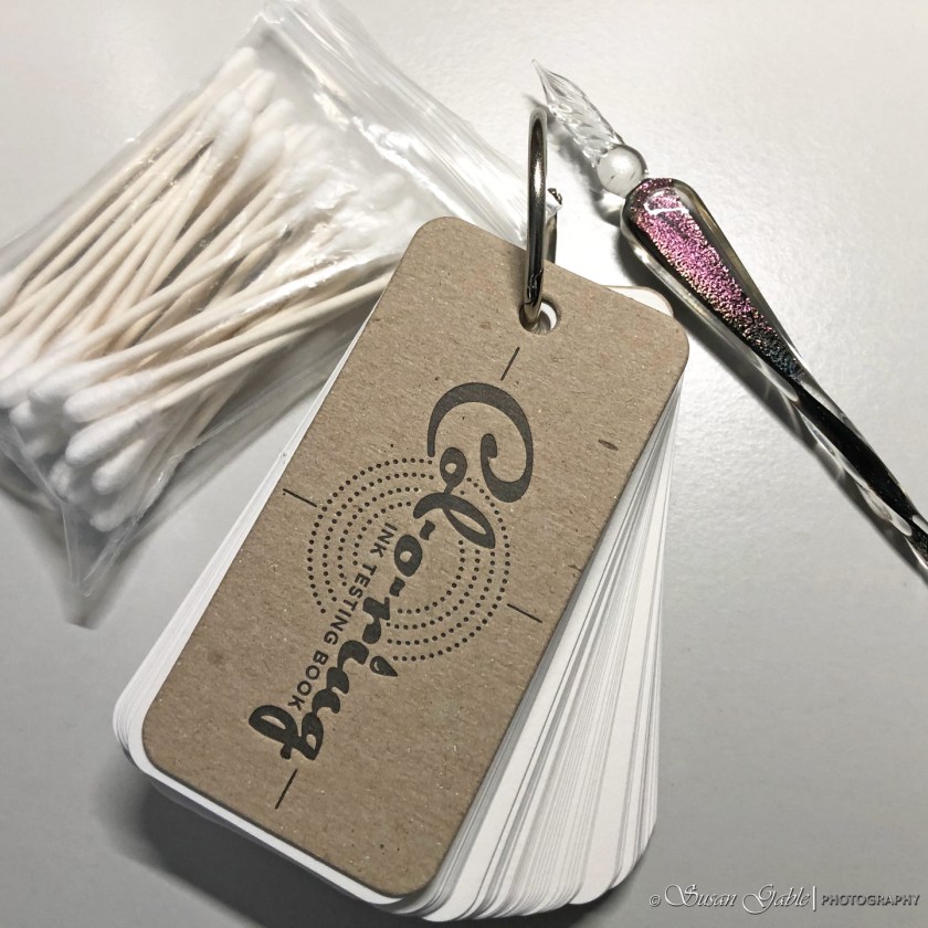 I will typically set aside a block of time to sit and swatch my colors. Usually, that means I have a handful of sample vials or a few bottles of ink that are waiting in a queue. Remember. I have a small work area and tools (ink towel, shop towels, etc) have to be collected and placed on my desk. Think of a quick setup and quick tear down. Hahaha!