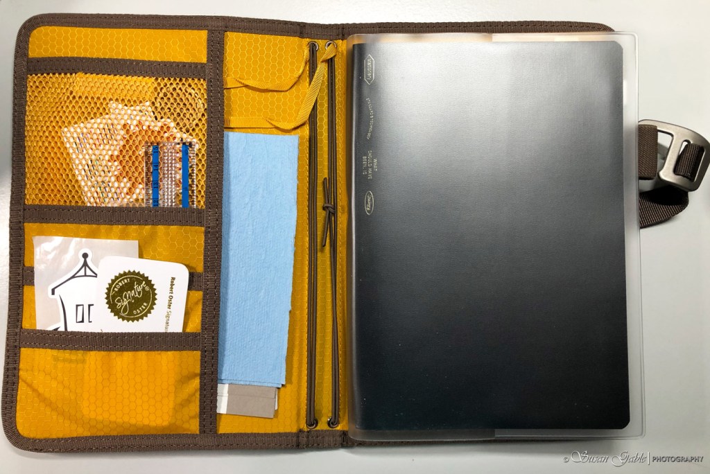 There are strings for holding your journal books. There’s also two bookmark strings to keep your place in your journal(s). Pockets galore are located on the left side. On the right side is a sleeve to hold folded papers or a journal like I have in my configuration.