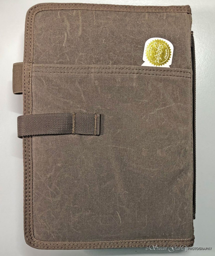 On the back spine there’s a durable web strap for those of us who need to grab our journal and go. On the backside of the cover is a velcro pocket.