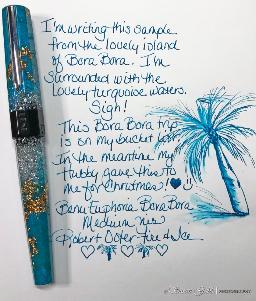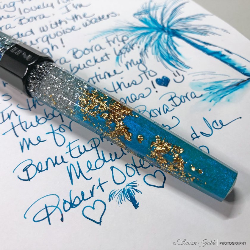 Which brings me to the above picture. I did not realize I would be getting a pad of Tomoe River Paper to match my new pen! How cool is that?! Oh yeah, more pictures of the pen…please. Here it is! My Benu Euphoria in Bora Bora!