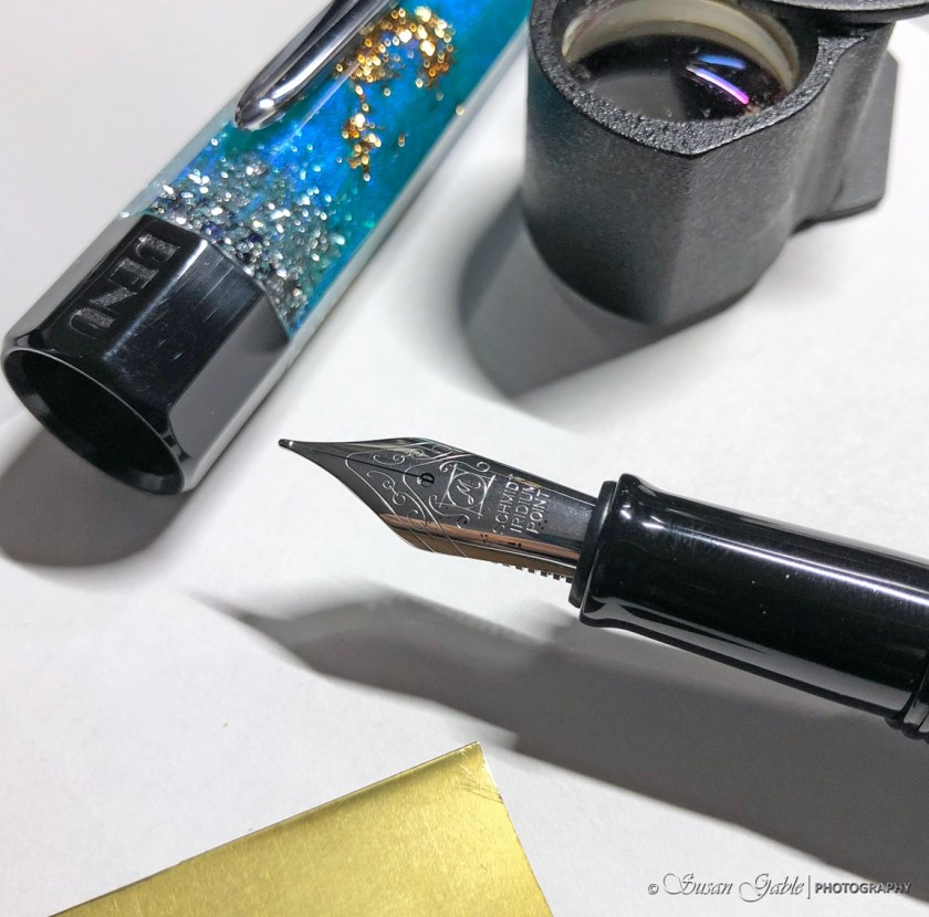 I grabbed my loupe and checked the tines. I could see “daylight” between the tines. Ummm…that would be good to see when there is no ink in the pen. Not in this case. I just filled this pen and there should be ink in between the tines to suggest flow.