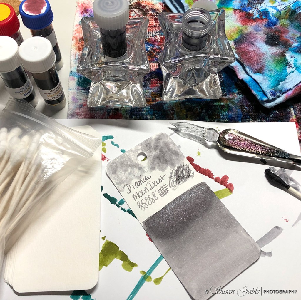 I ended up ordering Diamine Moon Dust and Snow Storm. Since I was on a Diamine Shimmertastic frame of mind, I decided to add samples of Cocoa Shimmer and Blue Flame.