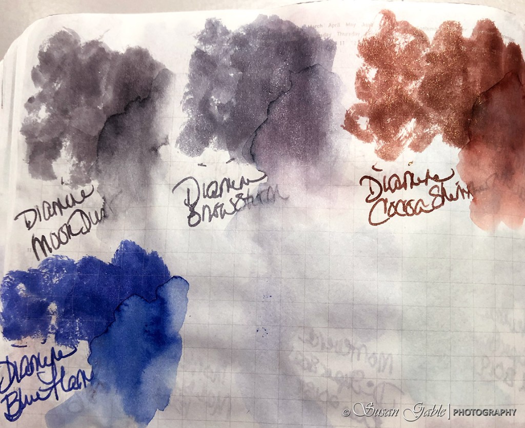 Inks: Diamine Moon Dust, Snow Storm, Cocoa Shimmer, and Blue Flame