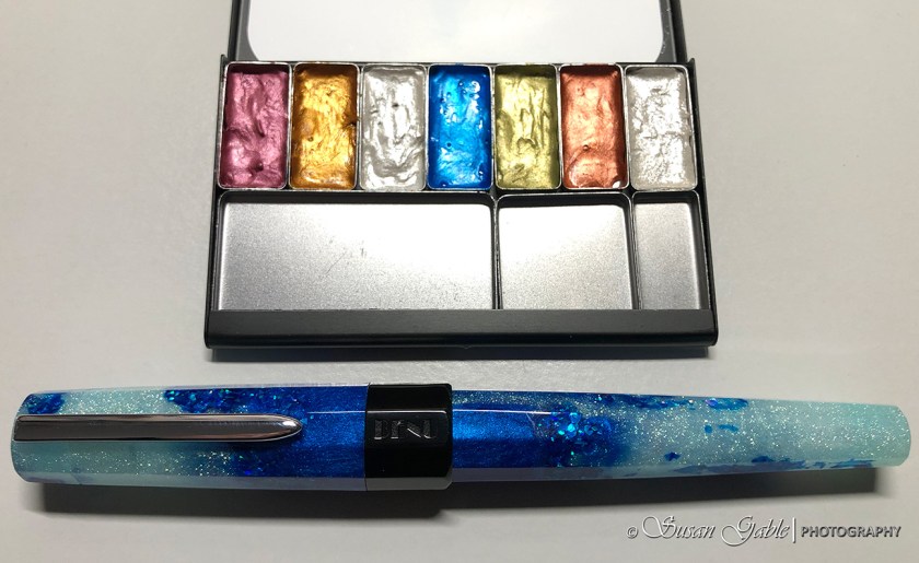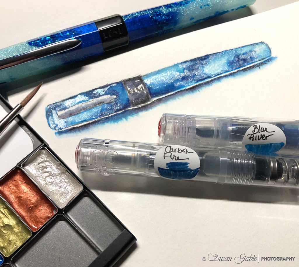 Naturally, I had to do a quick sketch of my pen. I decided to do a test sketch to see how the ink colors and iridescent watercolors play together. I wanted to make sure I could capture the glittering frothy surf.