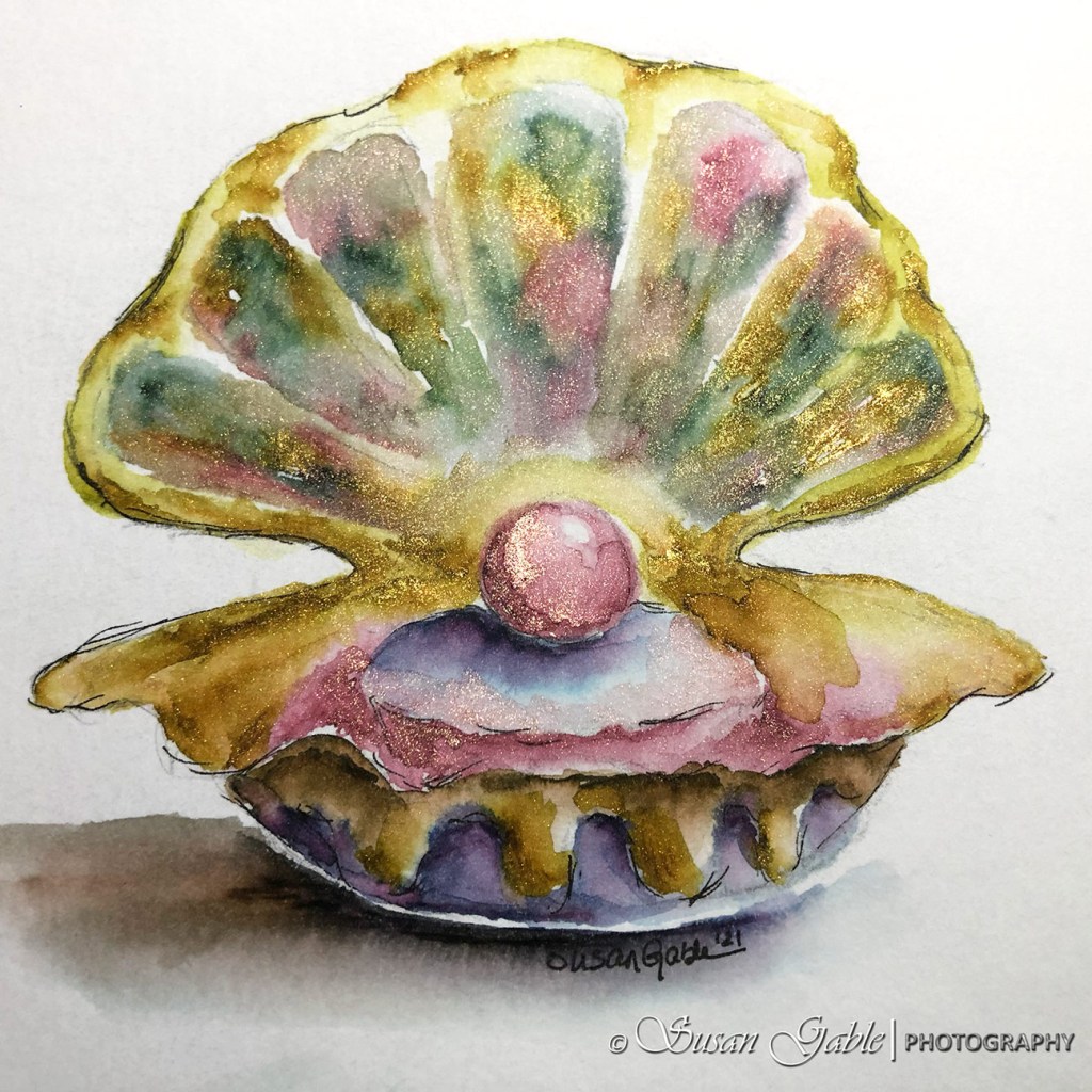 A few weeks ago, I had created a quick sketch of a shell. It was sitting in my art journal waiting for me to apply some color. Today, I finally got around to painting this shell with some bright and happy colors. This is what I came up with:
