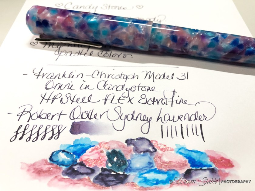 That’s the name of my beautiful fountain pen from Franklin-Christoph. I was looking for a pink and turquoise pen and saw this in their Stock Room. For me, the additional colors included in the pen (eggplant, indigo, rose, and teal) are extra bonus colors. I knew I had to act fast when I saw this one and I also knew I wanted another Flex nib. I selected a nib upgrade and went with their HPSteel FLEX Extra Fine nib.