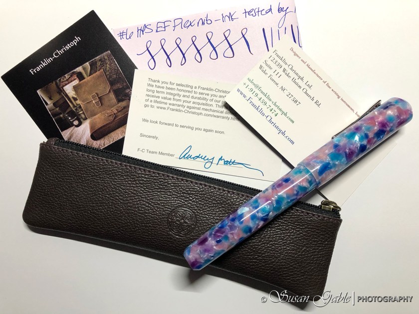 Franklin-Christoph did an exceptional job with their packaging. With this special Flex nib, I received a writing sample from Audrey. With each pen purchase, they included a warranty card that guarantees lifetime warranty against mechanical defect. F-C also included a zippered pen case to protect my pen.