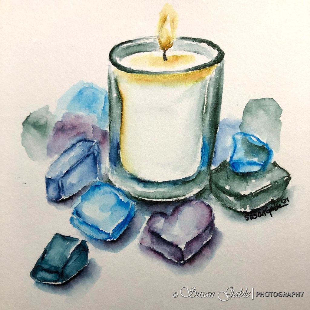 I love how this one came out. I took my time sketching the roundness of the glass candle holder. I also took my time applying the layers of color. A little bit at a time without overdoing it. My final layer on the candle holder was adding some reflective colors from the sea glass.