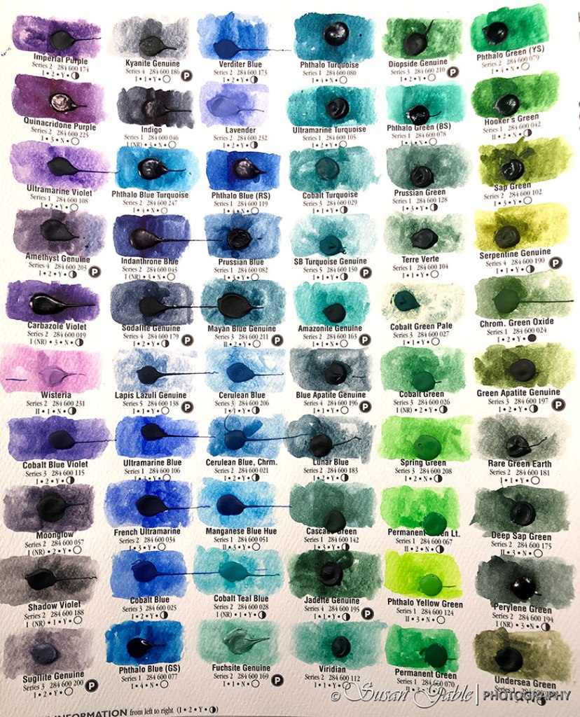 Dot Cards are a good investment. Both Daniel Smith and Winsor & Newton have dot cards. As you can see from the previous pictures, the cards contain the actual paint dropped onto a card along with the name of the paint, lightfastness, staining/nonstaining, granulation, and transparency. The color dot can be activated with a damp brush. Remember I mentioned about a tiny bit goes a long way? This card makes swatching so easy. You can see what the colors look like and the consistency before committing to a tube of paint.