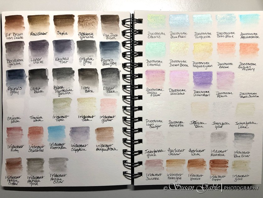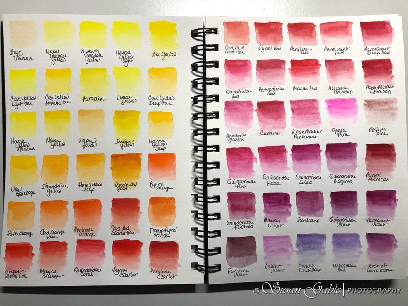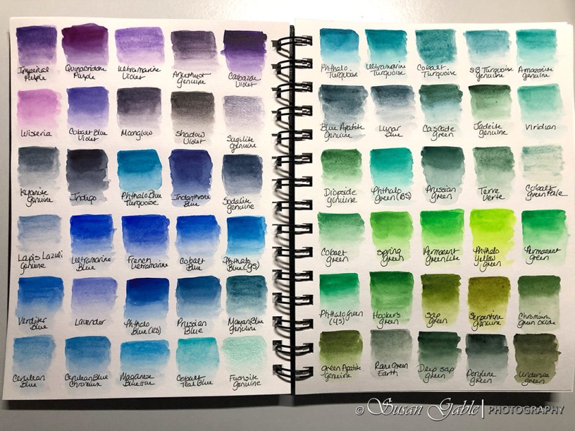 In a previous post I mentioned about swatching the dots on my Daniel Smith dot sheets into rectangle shapes of color. I decided to take it a step further and created color swatches in my watercolor art journal. So here are the 238 colors in my journal pages: