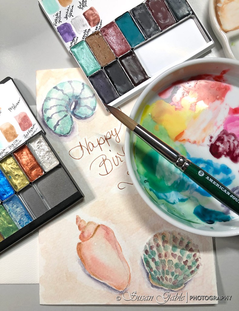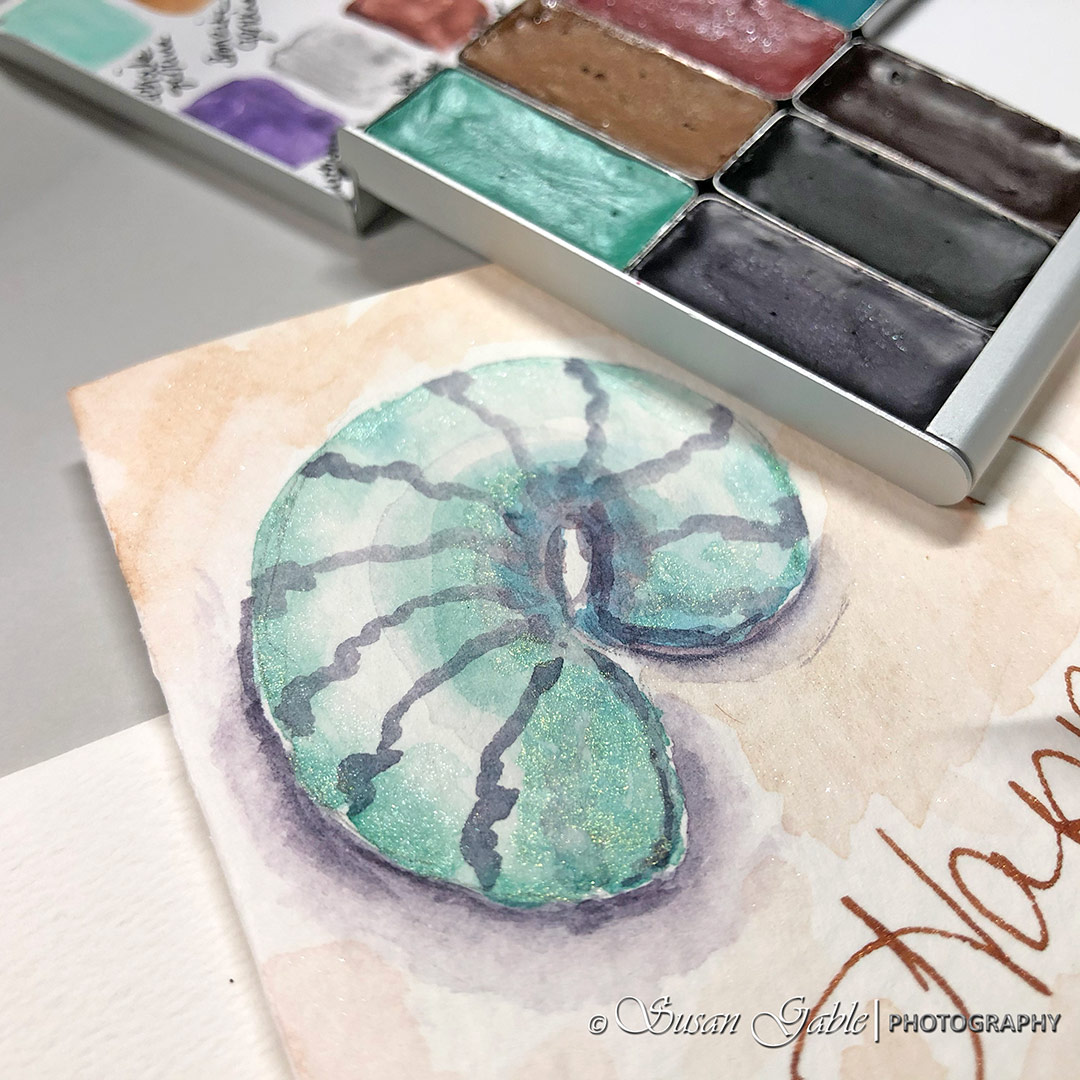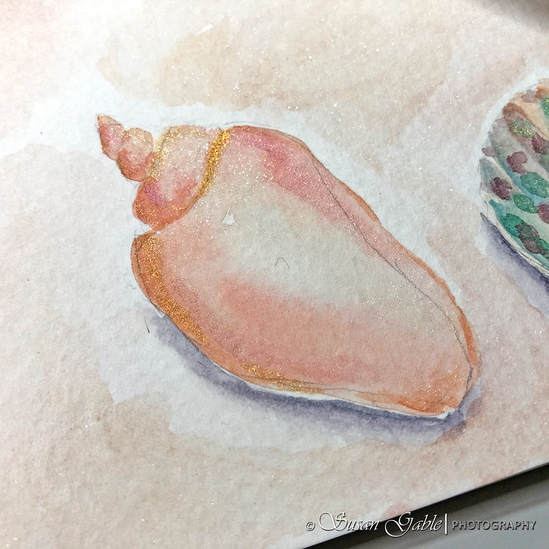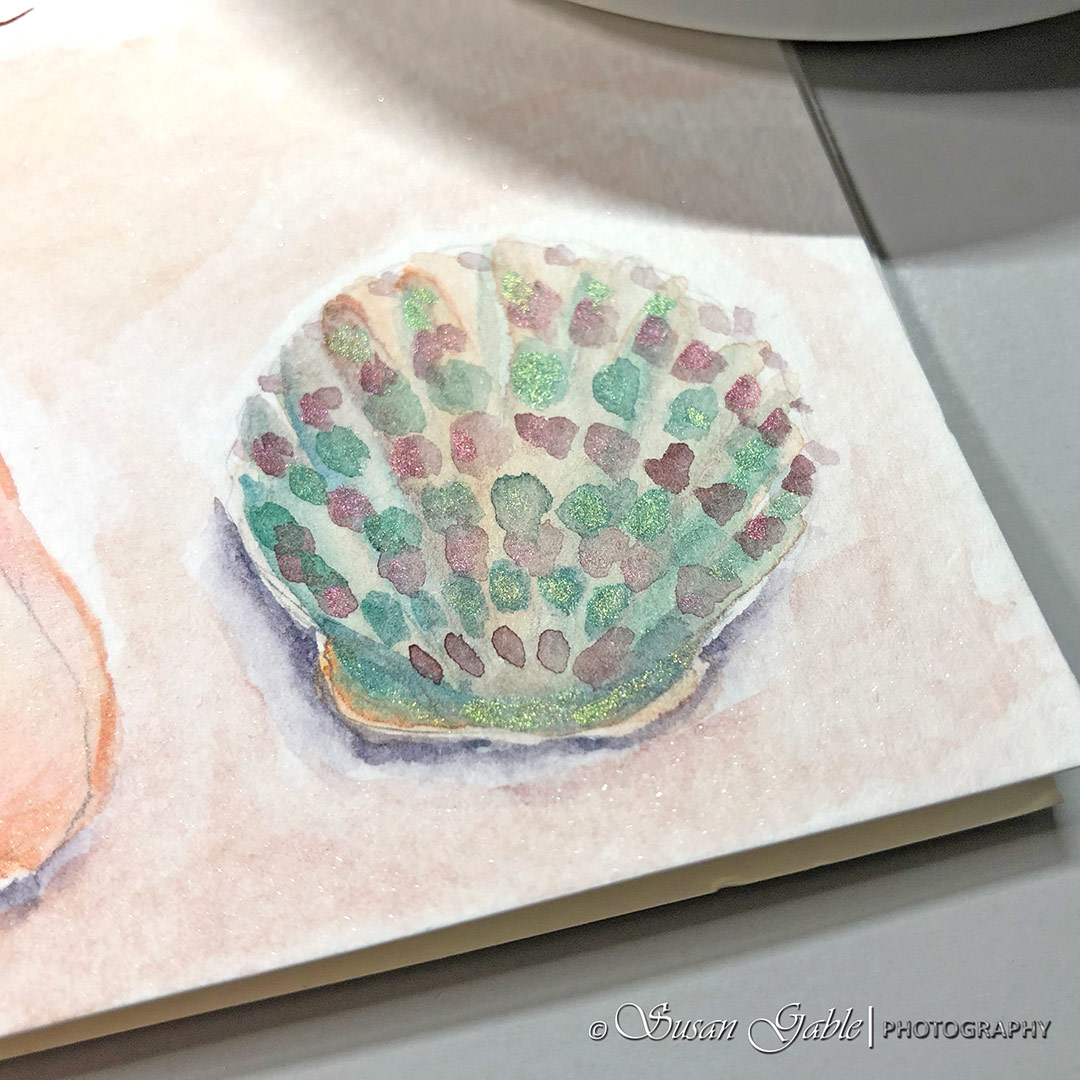 For the actual card, I decided not sketch the outlines with my carbon ink and fountain pen and instead used my watercolor paints to create the sea shells. I also added some shimmering colors over the shells to make them “pop” on the paper.