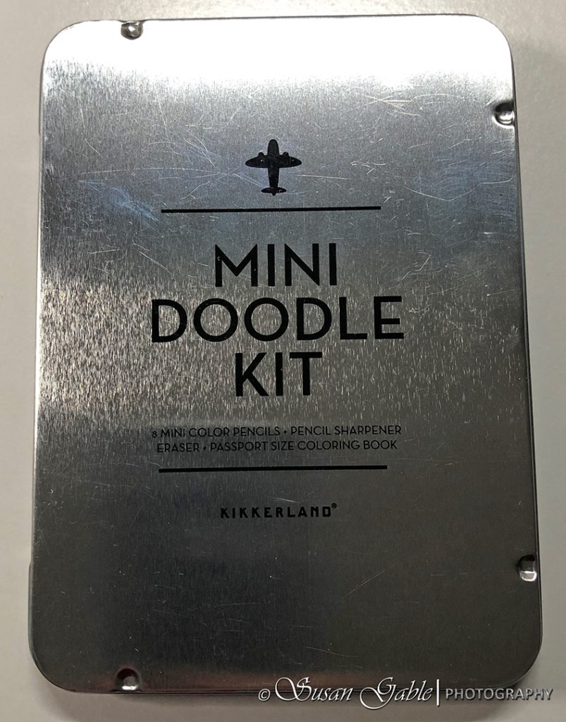 I was digging around my studio and saw a nice size metal case that contained a mini doodle kit I had received as a gift a few years ago. I enjoy reusing what I have and repurposing for my current needs. I knew this metal case would be large enough to hold all the colors I needed and still be portable.