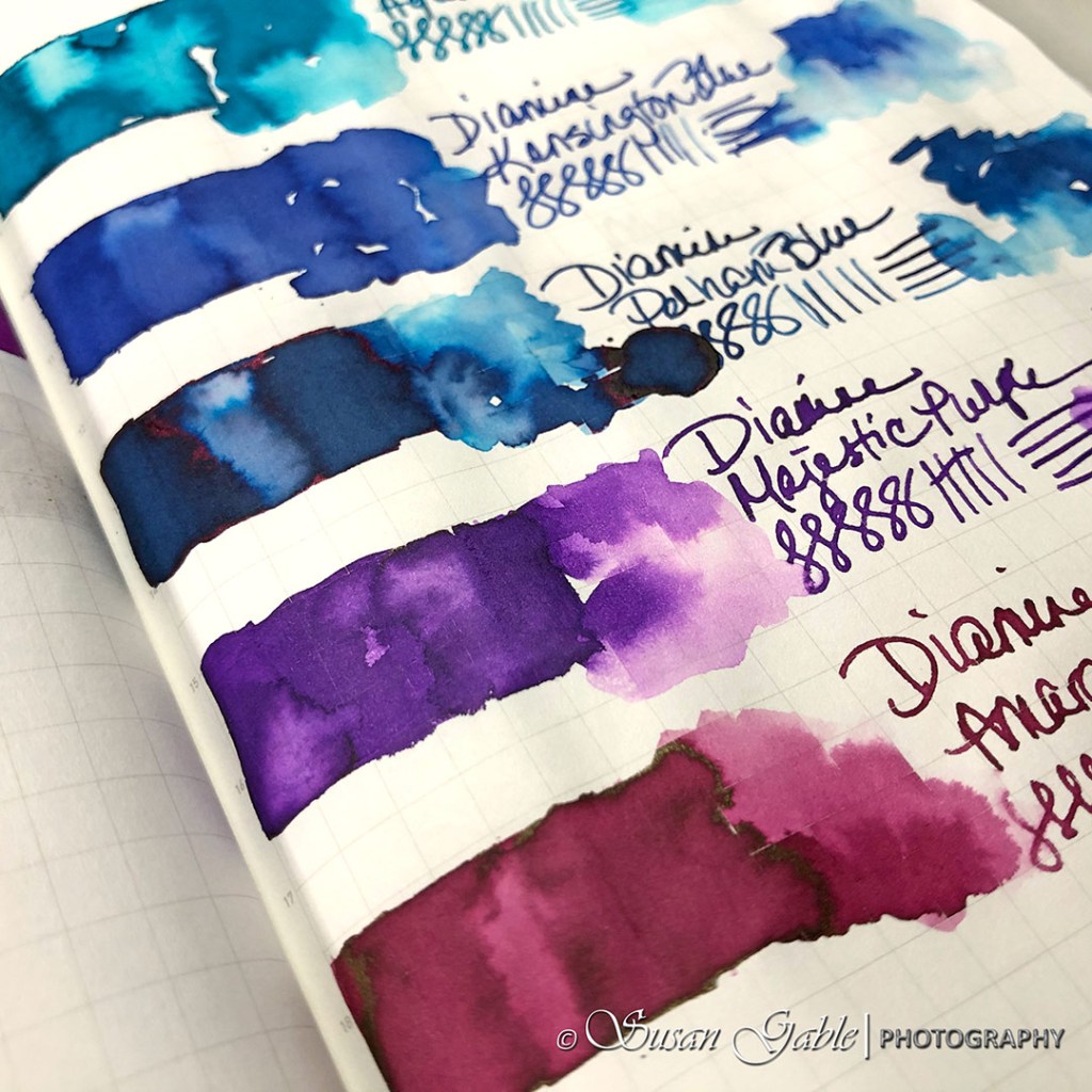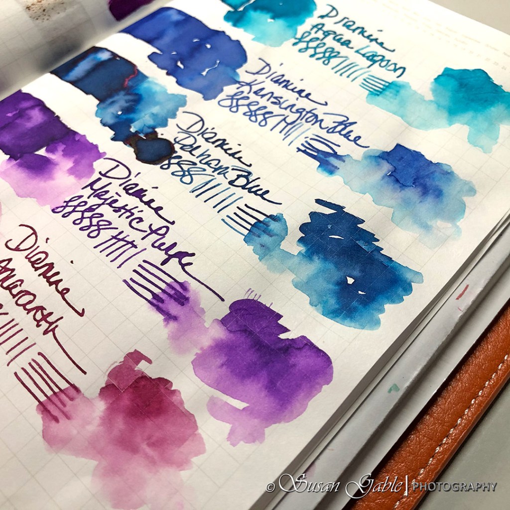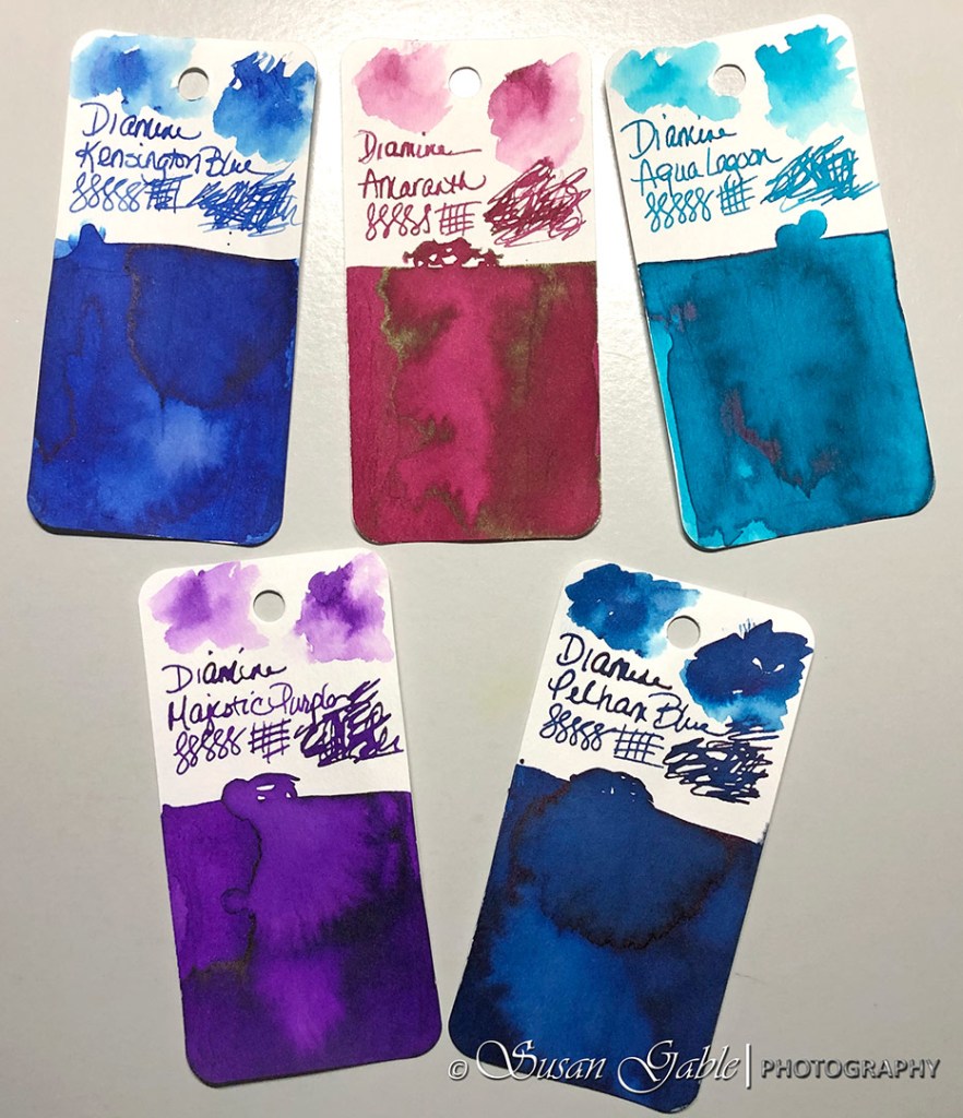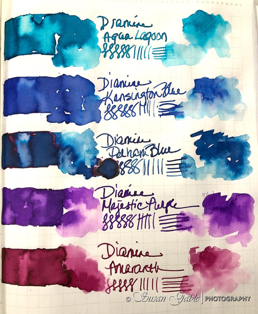 Inks: Diamine Amaranth, Majestic Purple, Aqua Lagoon, Kensington Blue, and Pelham Blue