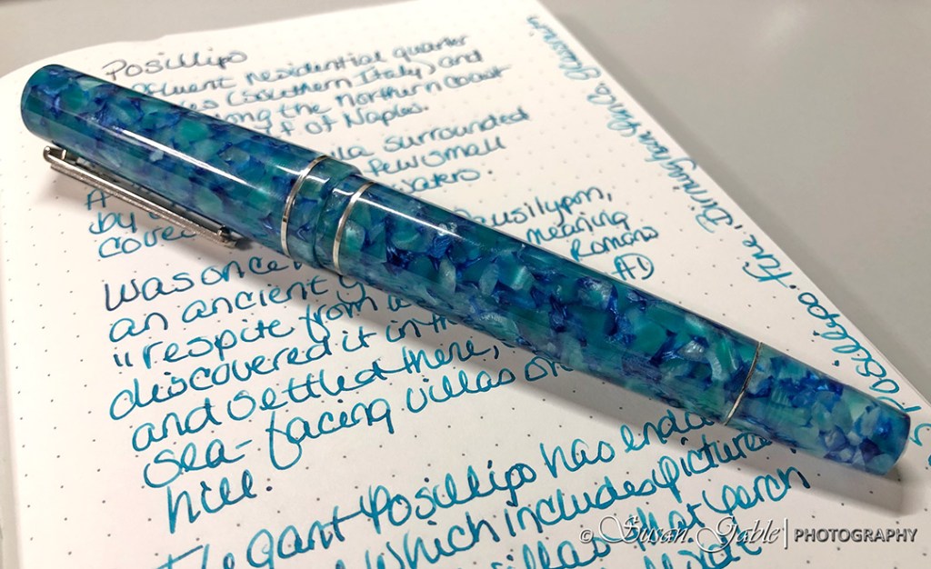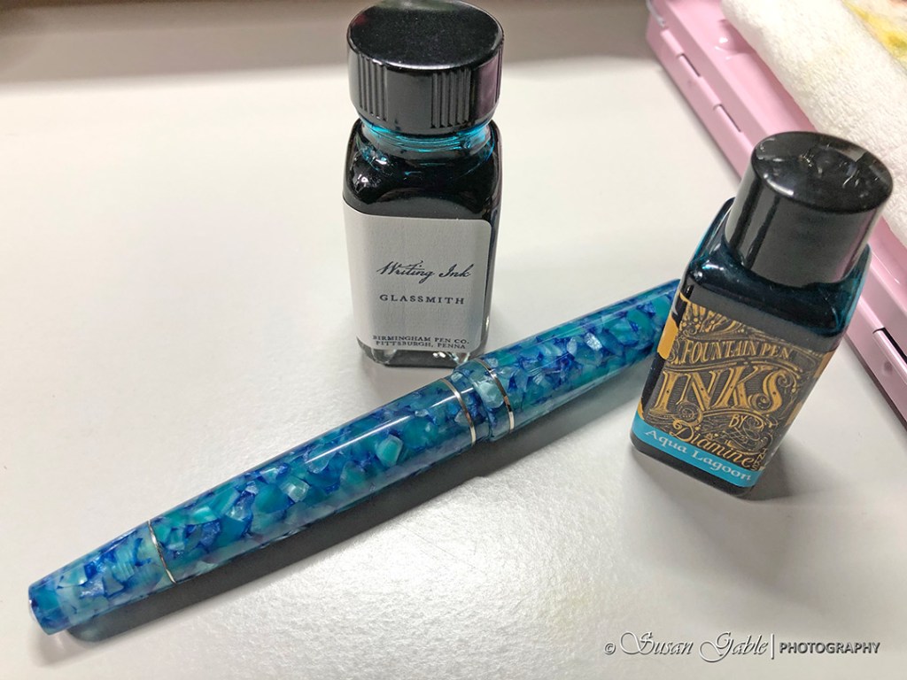 I had intentions of filling my pen with Diamine Aqua Lagoon ink. Too bad I could not get the girthy section of my pen into the narrow opening of the small Diamine bottle of ink. That was a first for me!