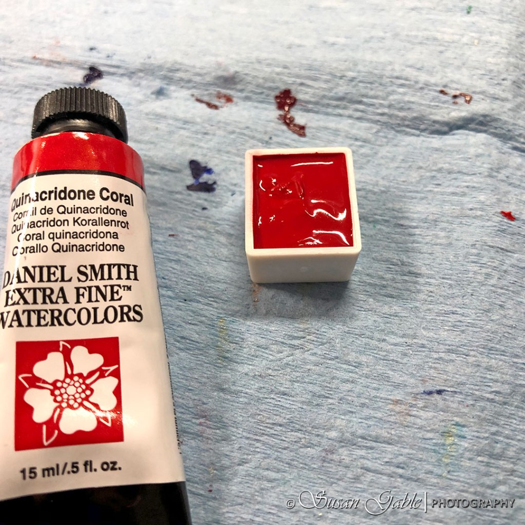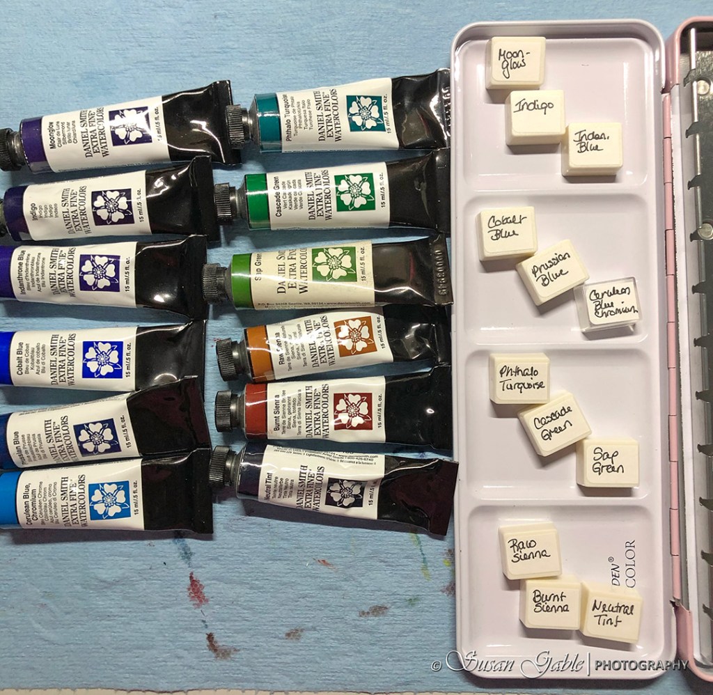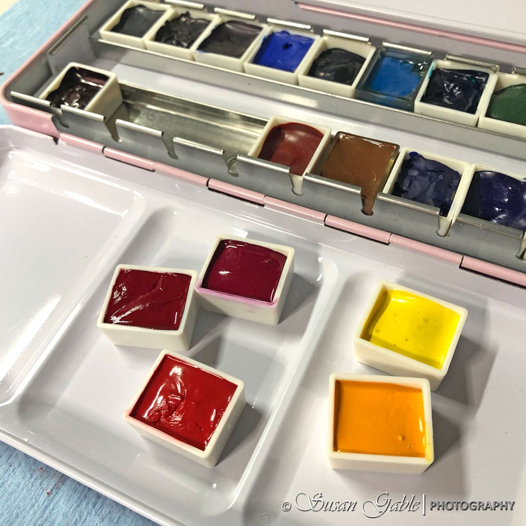 I had found a few empty half pan palettes sitting in my storage bin waiting to be filled with paint. I hate to see an empty palette not being used. I pulled out my 24-pan palette case and decided to fill them with my tubes of Daniel Smith colors.