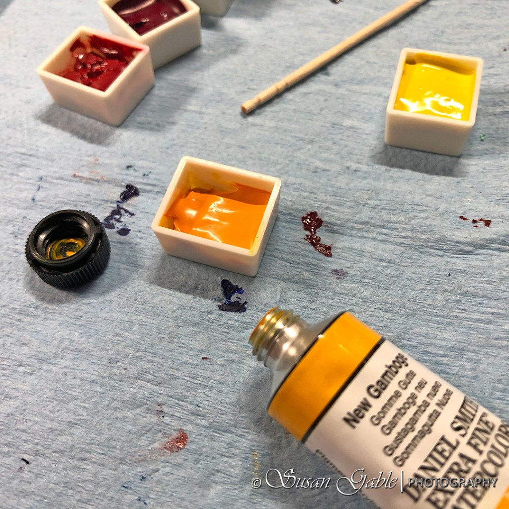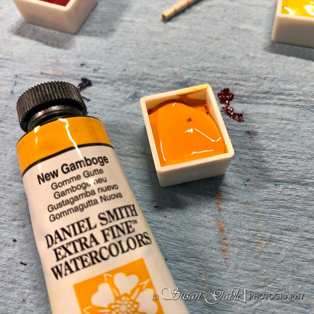 I pulled out a few pans that had shrunk quite a bit and filled them with a second layer of paint. My New Gamboge pan was a good candidate for another fill.