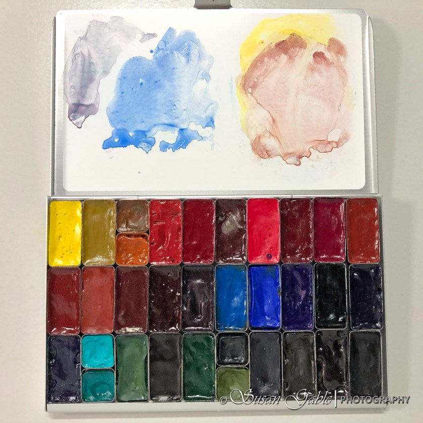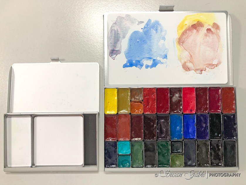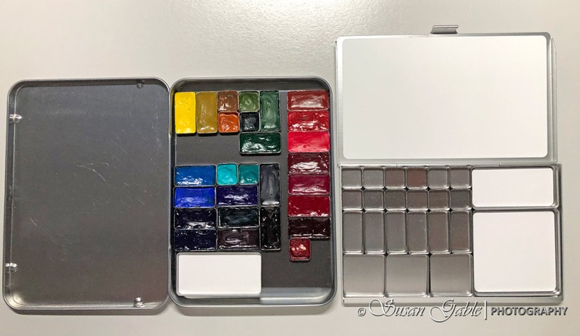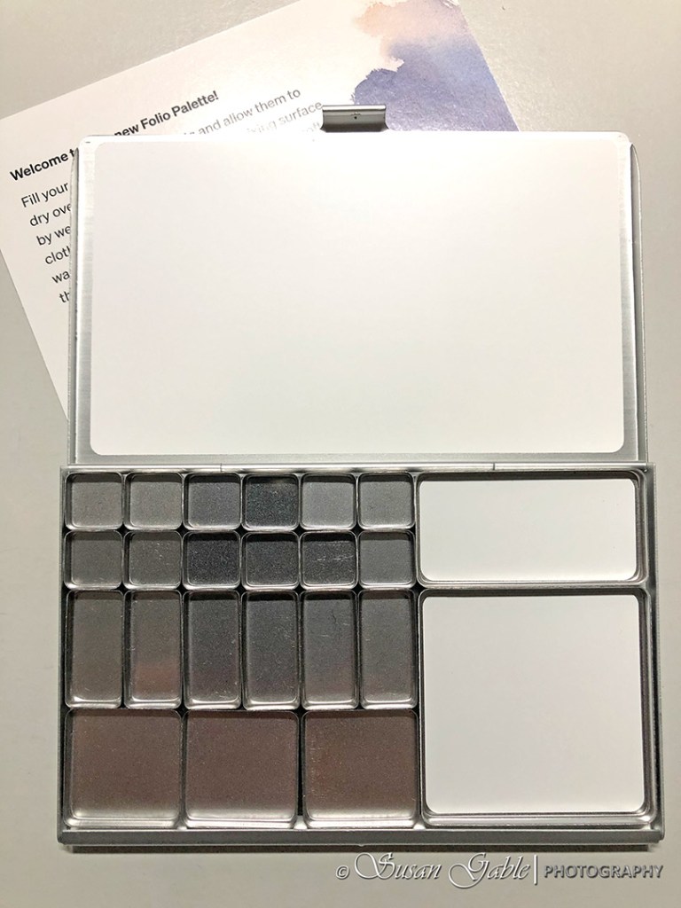 It looks like one of my other pocket palettes, right? This folio palette is actually a larger version that holds more pans of colors. Some folks actually use it on their desk/table and then take the pocket version for travel or plein air painting.