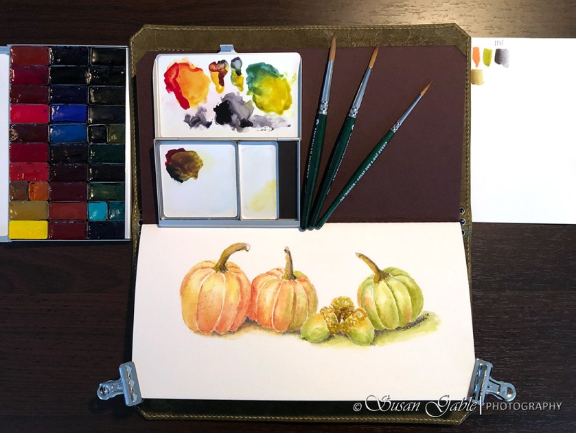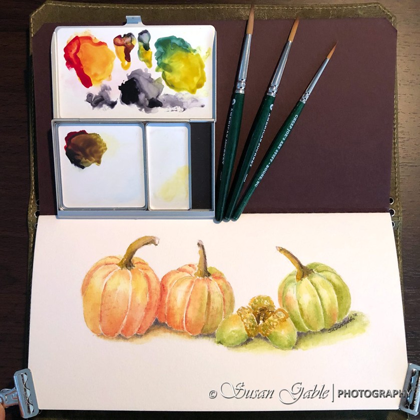 Remember I mentioned the epiphany I had in my previous post? It was about using less water in my watercolor paintings. This made a huge difference especially when using this new journal paper. I did notice when I used too much water, the paper would produce spots in the overly wet areas. You can see it on the orange pumpkin (far left).