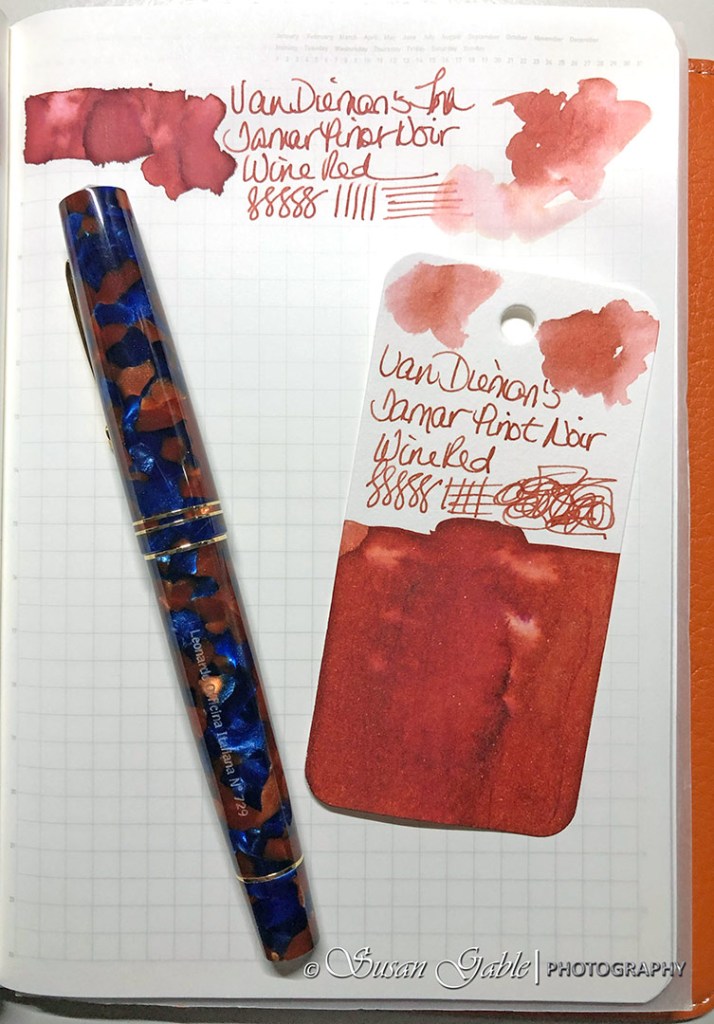 Here’s the most recent fountain pen ink acquisition from Fountain Pen Day. It’s a Van Dieman’s Ink called Tamar Pinot Noir from their Original Colours of Tasmania series. It’s a beautiful red ink that is a subtle color and leans a bit towards brown. It’s a red that has some character with some shading and a tiny bit of sheen.