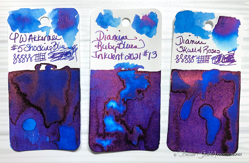 Ruby Blues reminded me of two other inks I have: Diamine Skull & Roses and PW Ackerman #5 Shocking Blue. My friend “M” gave me a sample of Skull & Roses which happens to be a German exclusive ink. My friend “J” sent me a lovely bottle of Shocking Blue. All three inks have the same blue ink color and very similar sheen.