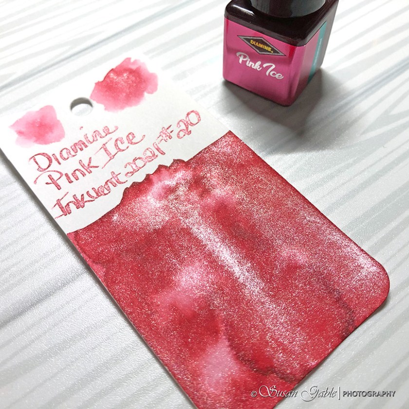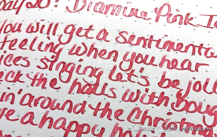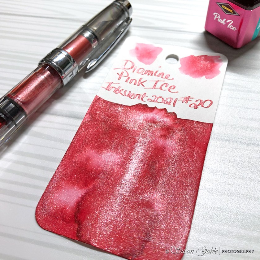 My favorite shimmering pink ink is Robert Oster Blood Rose. I think it’s been replaced with this lovely Pink Ice which is definitely brighter. In the following picture, I show my Diamine Red Lustre swatch card for comparison. Pink Ice is not a light weight pink color. It can definitely hold its own.