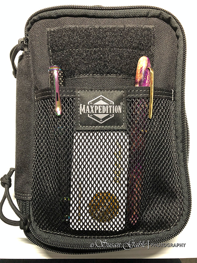Here’s the front of my case. I lightened the picture slightly to show off the stitching and how well made this case is. Remember I am a sewist and I look for good stitching. The front has two velcro pieces at the top if I wanted to add a personal patch. There is also a front pocket made of netting that is secured with velcro behind the Maxpedition logo. I added two fountain pens and a blotter card to show the pocket size.