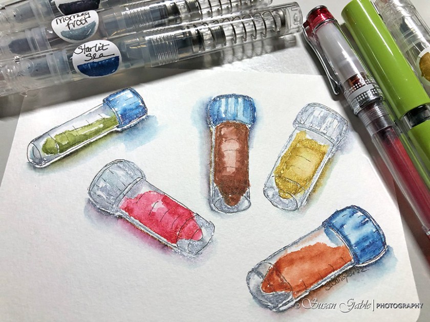 Inks: Colorverse Brane. Van Dieman’s Ink Morning Frost. Robert Oster Heart of Gold and Thunderstorm. Diamine Pink Glitz, Cocoa Shimmer, Vintage Copper, and Starlit Sea.