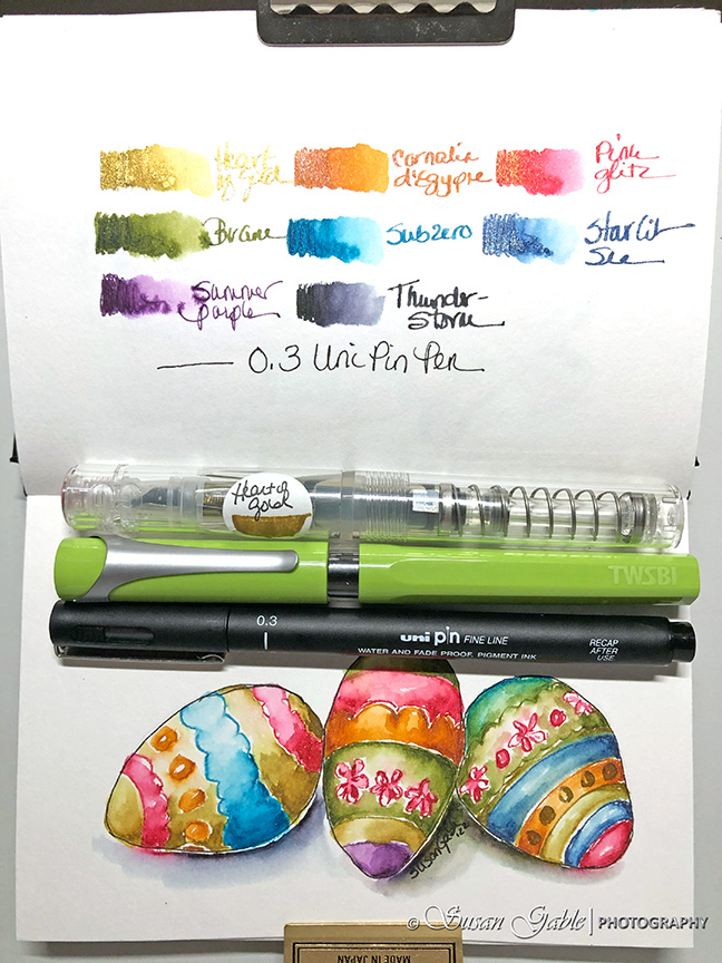 Pens: Uni Pin Fine Line pen in 0.3mm. TWSBI Swipe in Pear Green with Stub 1.1 nib. TWSBI GO with Stub 1.1 nib.