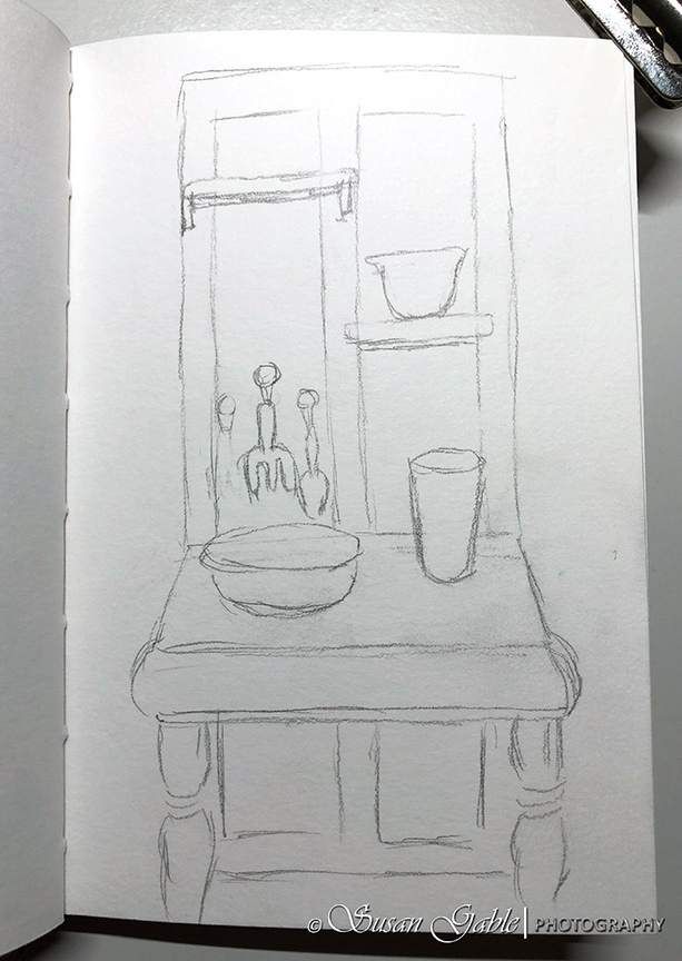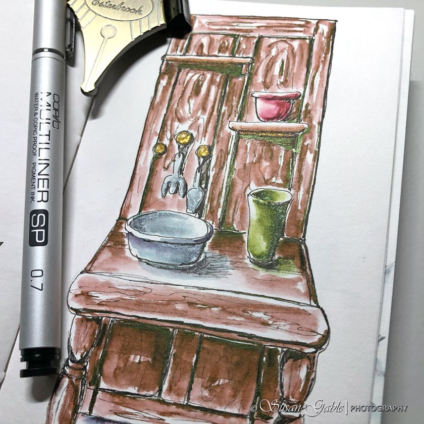 I started with a pencil sketch and drew in the major lines or outlines of the various objects. I used my Copic fine line pen (0.7mm) and went over the main areas I wanted to include in my sketch. I used my Copic fine line pen (0.1mm) to add in some details and also to create some shadows.