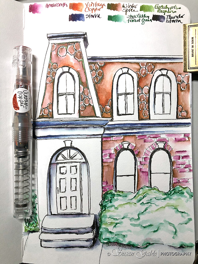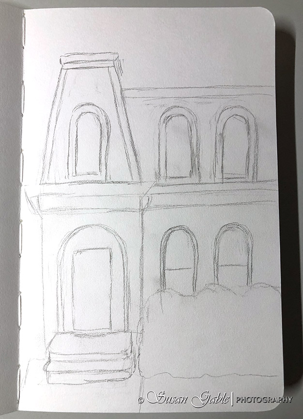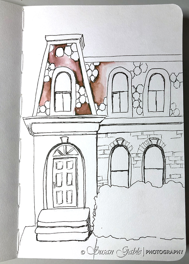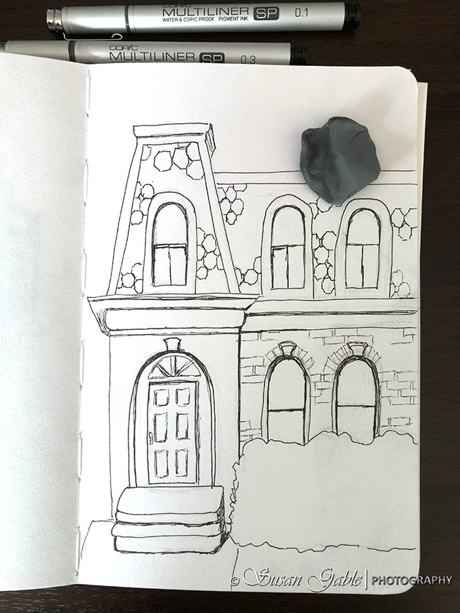 I used my fine line pens to redraw the lines I wanted to keep. I used my eraser to remove the unwanted and stray lines. I left out some of the roof tiles and brick work to let the viewer fill in their own details.