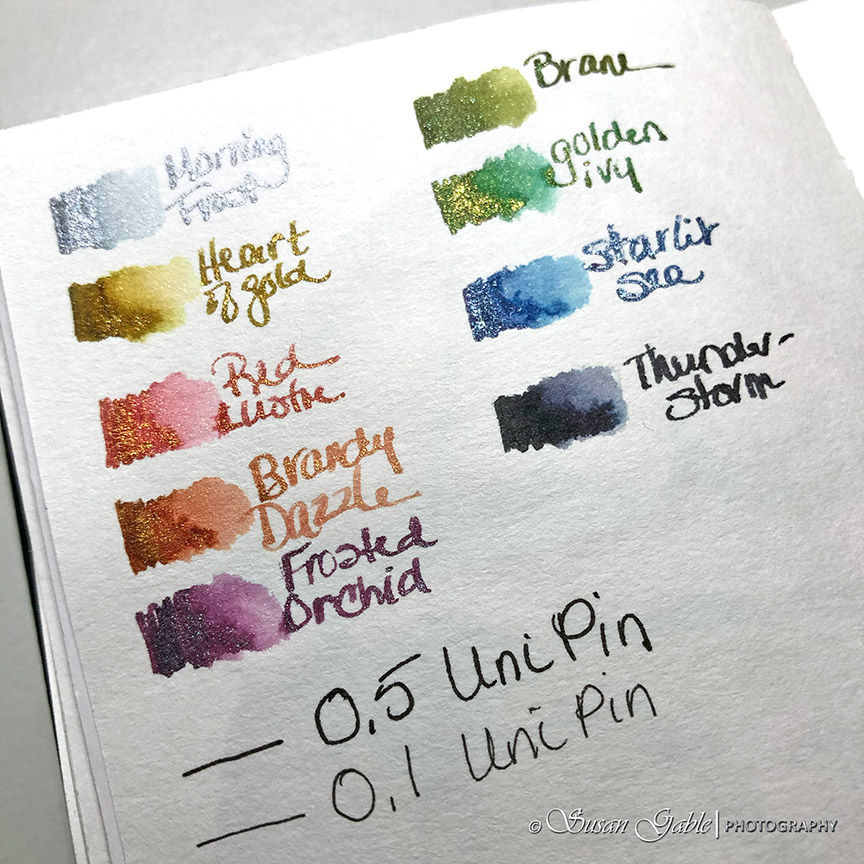 Inks: Van Dieman’s Ink Morning Frost. Colorverse Brane. Robert Oster Heart of Gold and Thunderstorm. Diamine Red Lustre, Brandy Dazzle, Frosted Orchid, Golden Ivy, and Starlit Sea.