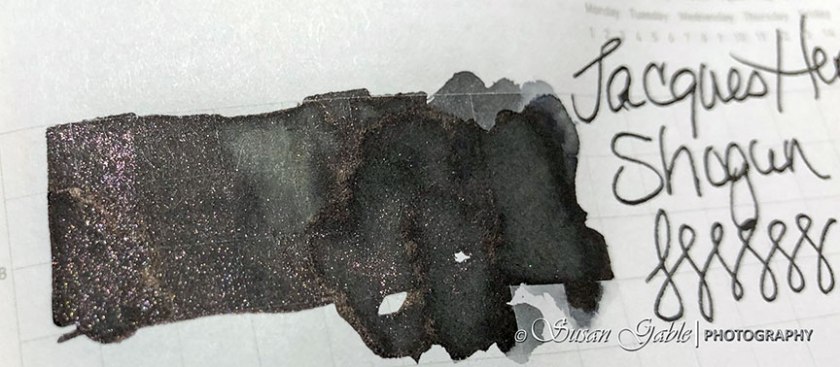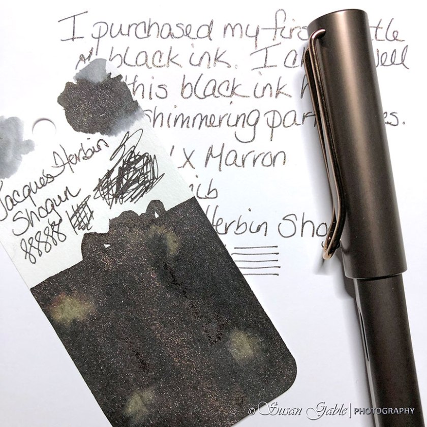 To me, it’s a subtle black ink. I’ve seen a few folks comment that it’s dark brown. From my swatch and writing sample, I do not see any brown at all. This ink has a lovely flow in my Lamy pen. The sparkles are subtle and beautiful at the same time.