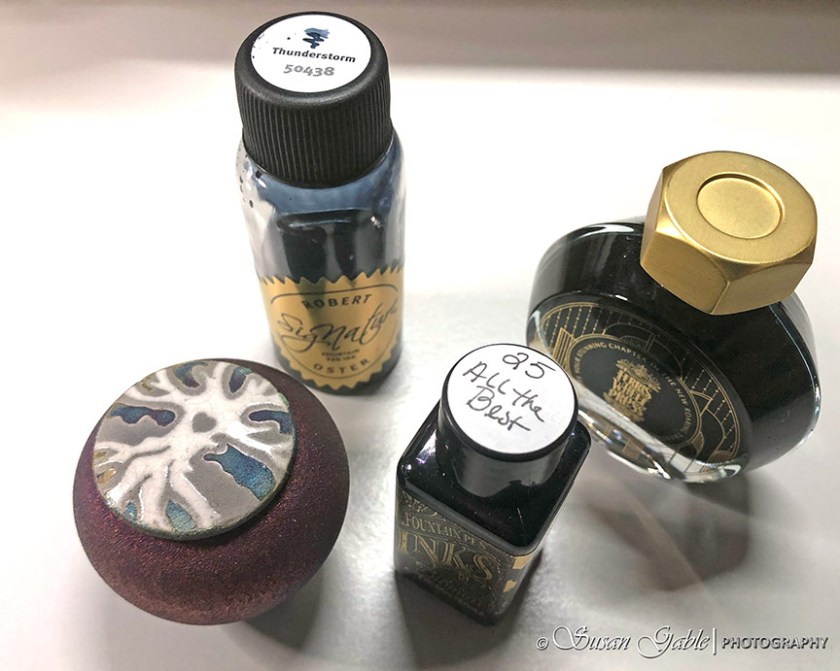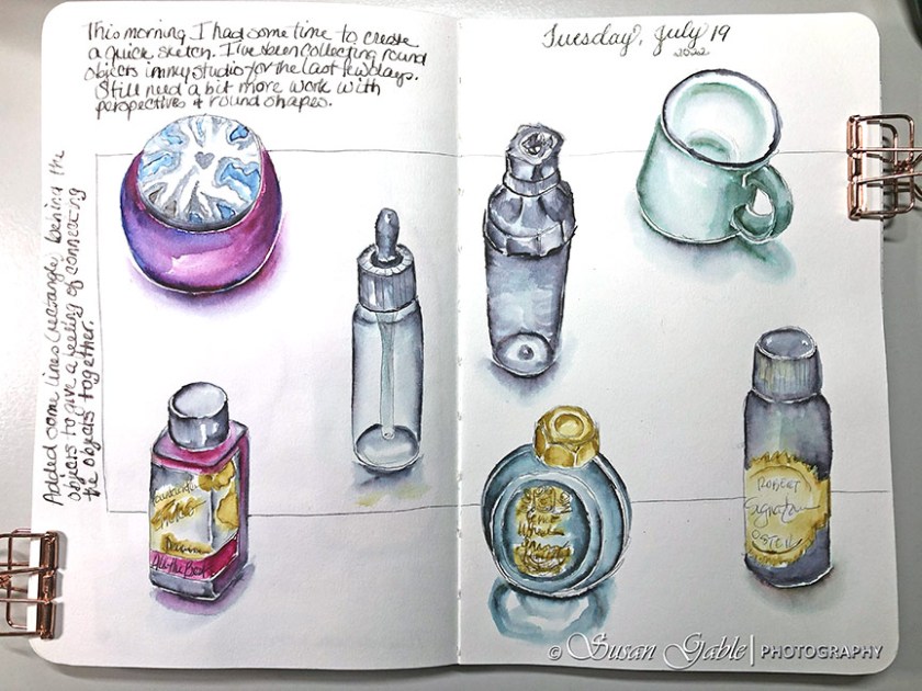 My challenge is for you to look through your inky bottle collection. Pick out three (3) bottles of your favorite ink brands and try sketching them from the top down view and then from the side view (if possible).
