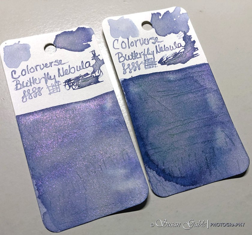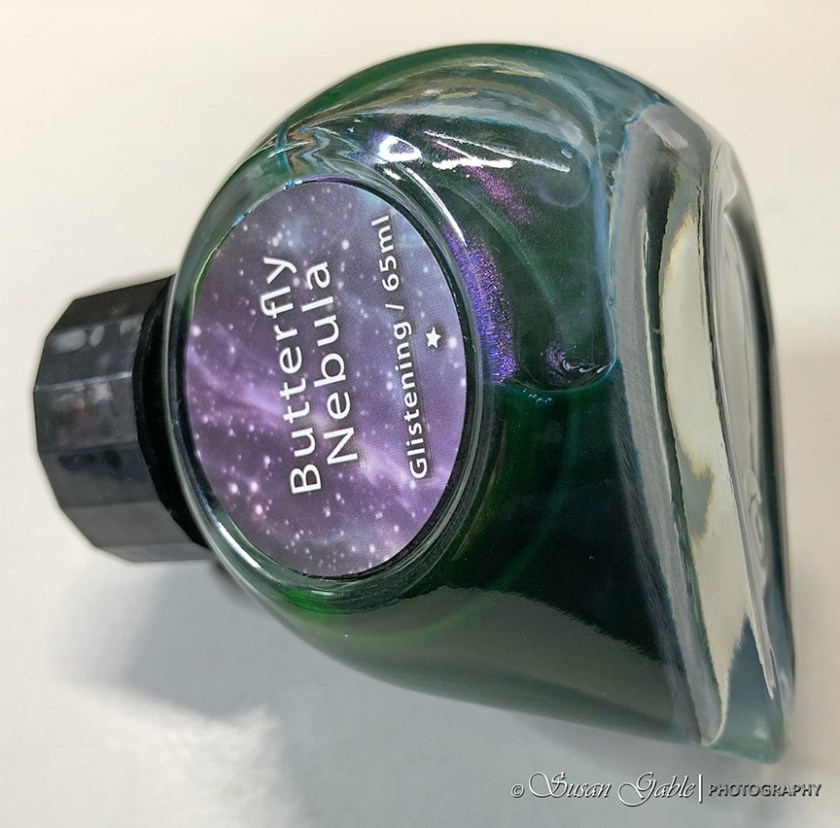 Fast forward to now and I have this lovely ink in my hands. I could not resist turning my bottle of Butterfly Nebula to see what shimmering colors would appear.