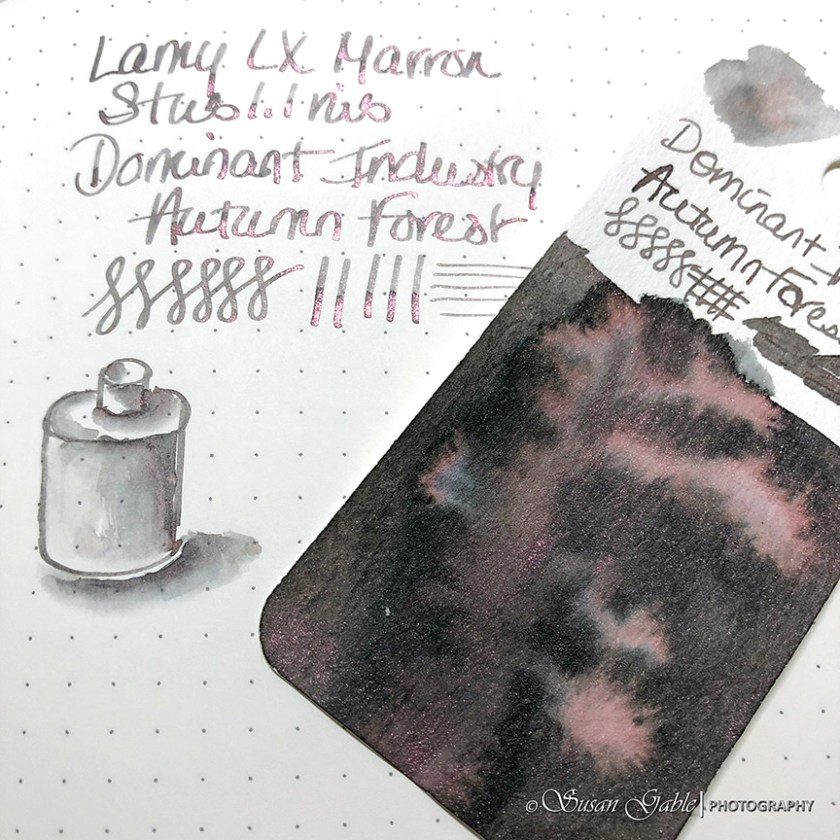 The Autumn Forest ink color is a unique ink color. I say that as it depends on what paper you use this ink on. On my swatch card, the ink appears to be a medium gray ink color. This ink has a pink and a bit of blue undertone colors as well as rose gold shimmer. Depending on the lighting, the ink color could also be considered gray-brown.