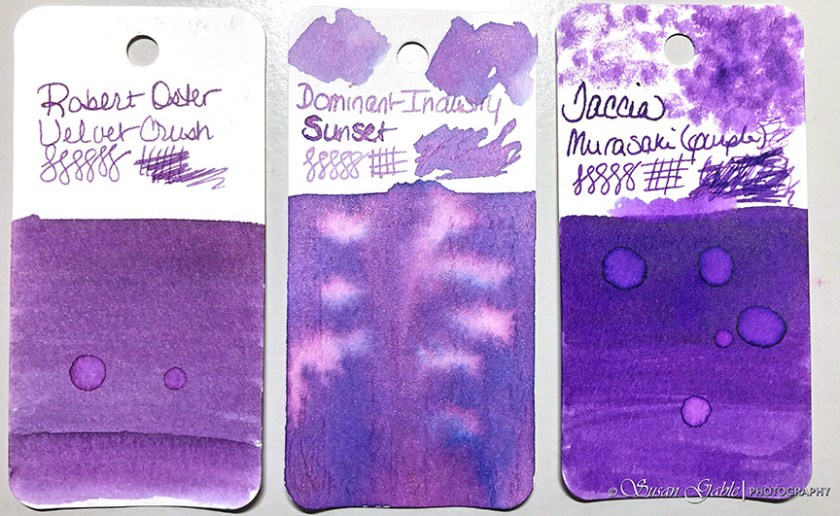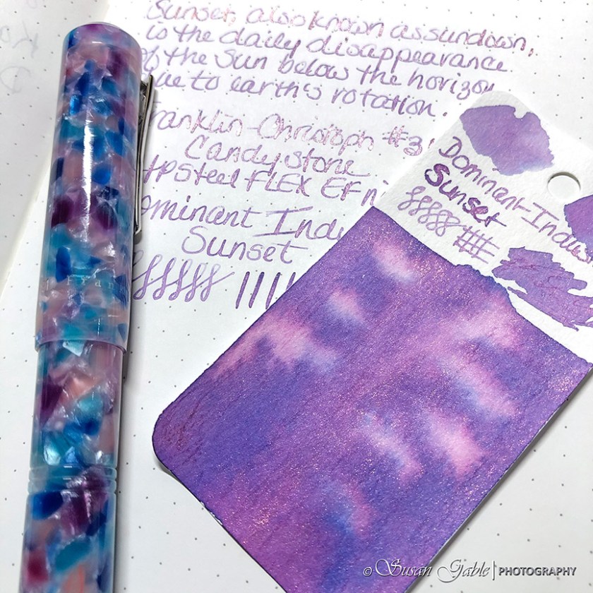 The Sunset ink is an unusual dusty purple ink that leans a bit towards rose. There are pink and blue undertone colors along with a rose gold shimmer. I feel as though the shimmers makes the purple ink lean a bit more towards pink.