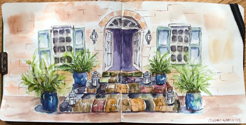 I created the following sketch back in 2019. This was my first attempt at creating a two page spread. I used a combination of my fountain pen inks and watercolors to create the front entrance of a house I visited while on the island of Nevis.