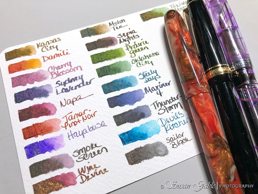 I used a 4″x6″ watercolor paper post card to create my swatch card. So far, this includes 19 inky colors I am currently using for this month. These inky colors reside in my TWSBIs, Pilot, Opus 88, Nahvalur, and Indy pens. That includes about a dozen TWSBI GOs.