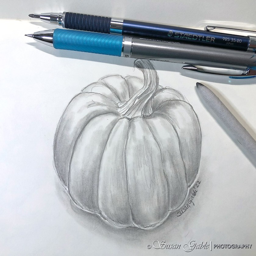 Challenge: Find a pumpkin to use in your sketches. Use a picture if you can’t find a real or fake pumpkin. Use your pencil to create a graphite sketch. Then use your fountain pens and ink to create the second pumpkin sketch. If you have another art medium available (watercolor, charcoal, pastel, etc) create a third sketch.