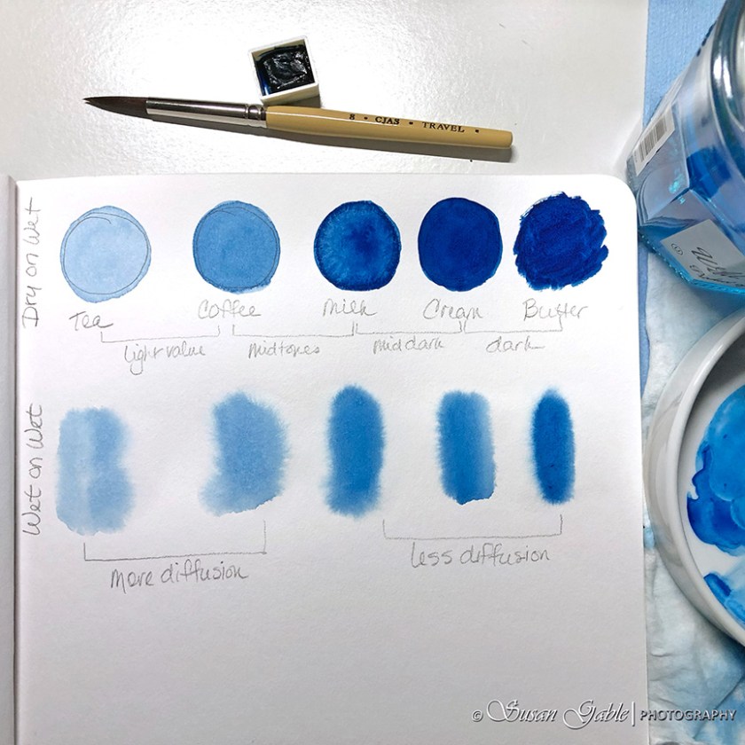 In the top row, I painted my circles using a dry-on-wet technique. My tea sample is what I would typically paint for my base color. Also, this shows I have the tendency to use too much water when I’m painting and mixing my colors. I have to remind myself to dab my brush on my towel before applying my brush to the paint or paper. By the time I get to the butter consistency sample, this is basically lots of paint and very little water. You can see my brush strokes around the edges.
