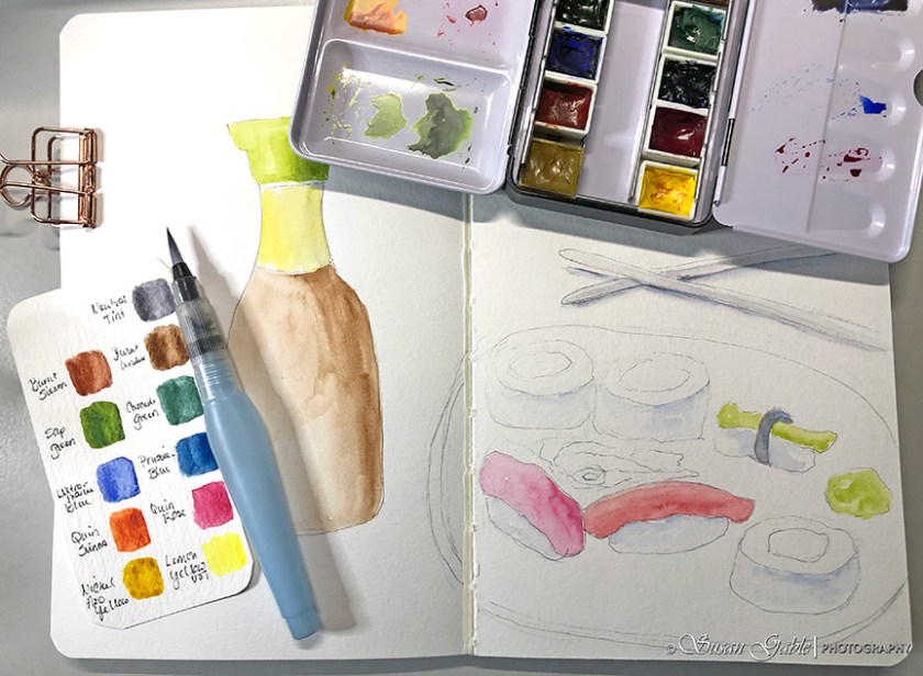 This week, I had lunch at a local sushi restaurant. My watercolor sketch is mostly from memory and just playing around with mixing colors. This sketch shows my first layer of colors. A work in progress.