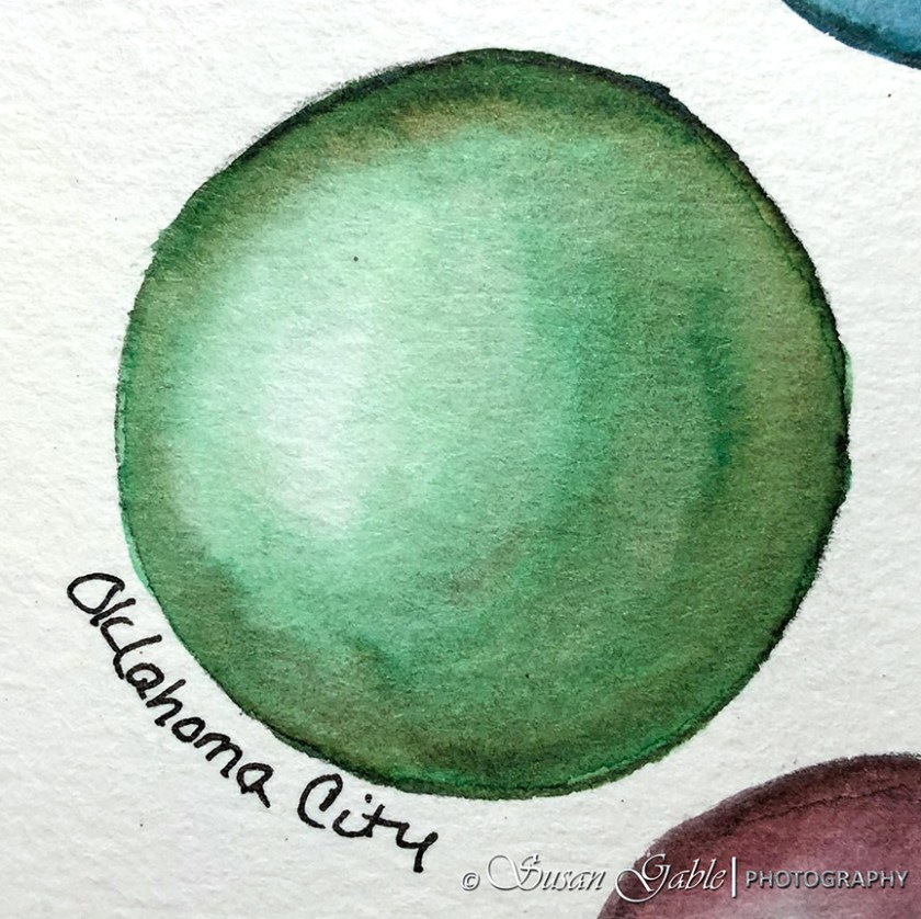 I used a few of my Daniel Smith PrimaTek colors which is represented with the “Genuine” in the name. I absolutely enjoy using these special granulating paints made from natural minerals and pigments. Jadeite Genuine is a gorgeous color. It’s made from the mineral called jade. Its fountain pen inky cousin would be Oklahoma City.