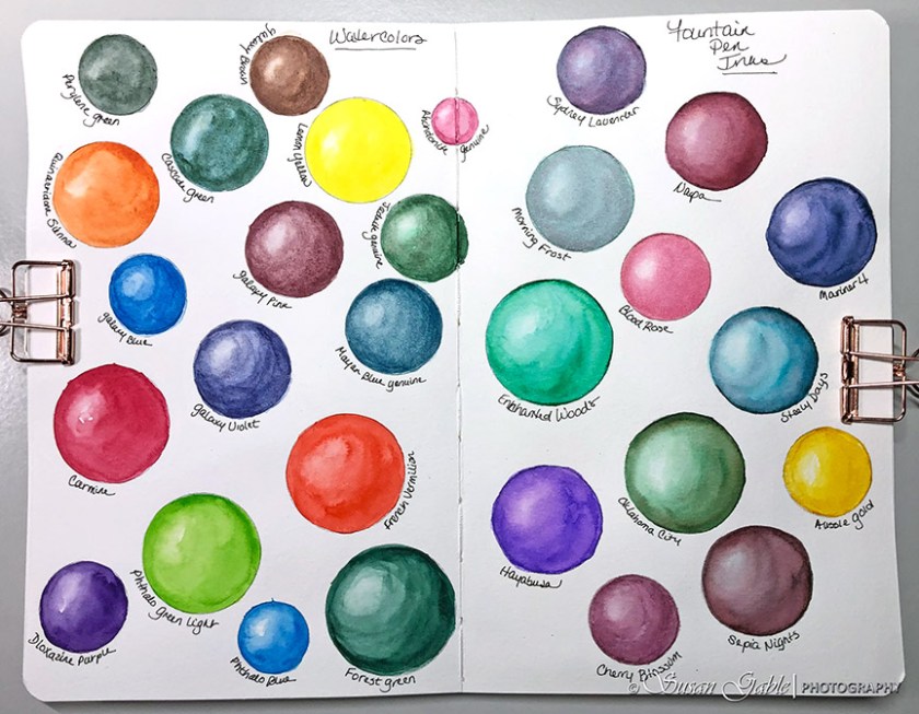 In some circles I took my fountain pen and drew an outline. I took my water brush and touched the breather hole of my fountain pen to draw out a bit of color. I painted inside my circle and also touched the outline to pulled the color into my circle. I tried to leave a bit of white or light color areas to represent the highlight of my circle. I also cleaned my water brush (wiping on clean towel) and gently brushed out the color where I wanted my highlight to be. A clean q-tip could be used to dab out the slightly wet color.