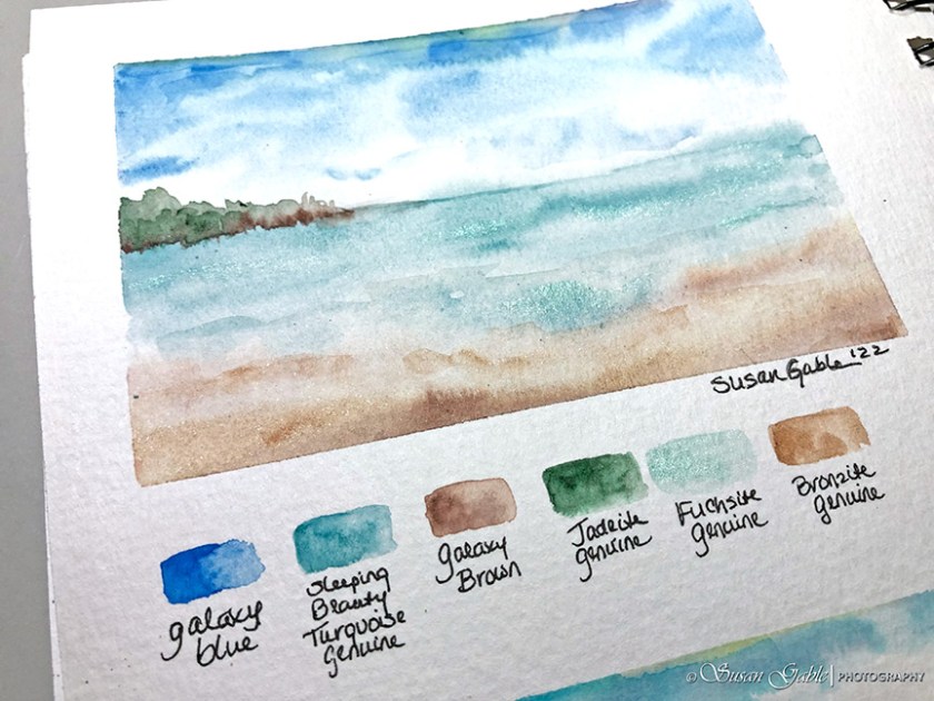 Watercolor: Schmincke Galaxy Blue and Galaxy Brown. Daniel Smith Primatek Sleeping Beauty Turquoise Genuine, Jadeite Genuine, Fuchsite Genuine, and Bronzite Genuine.