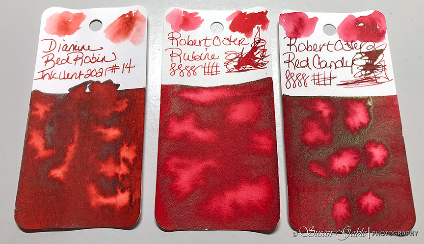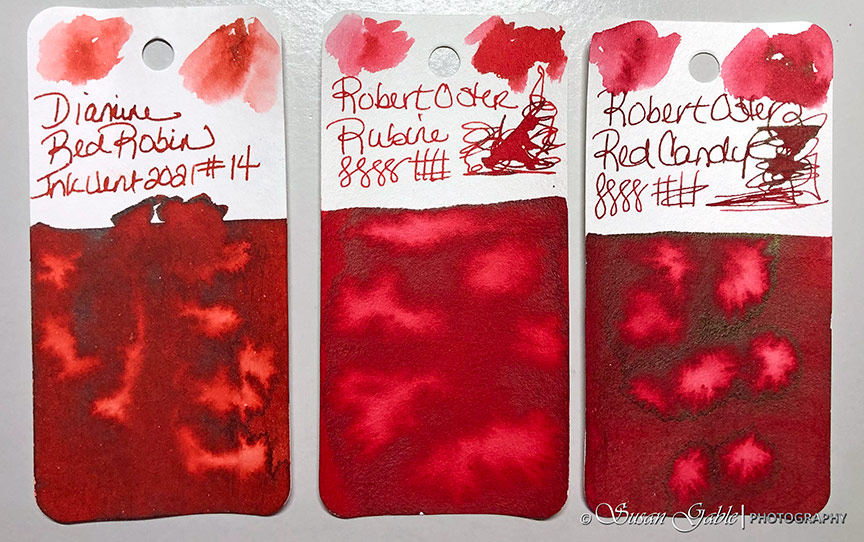 Ink swatches: Diamine Red Inkvent Red Robin. Robert Oster Rubine and Red Candy.