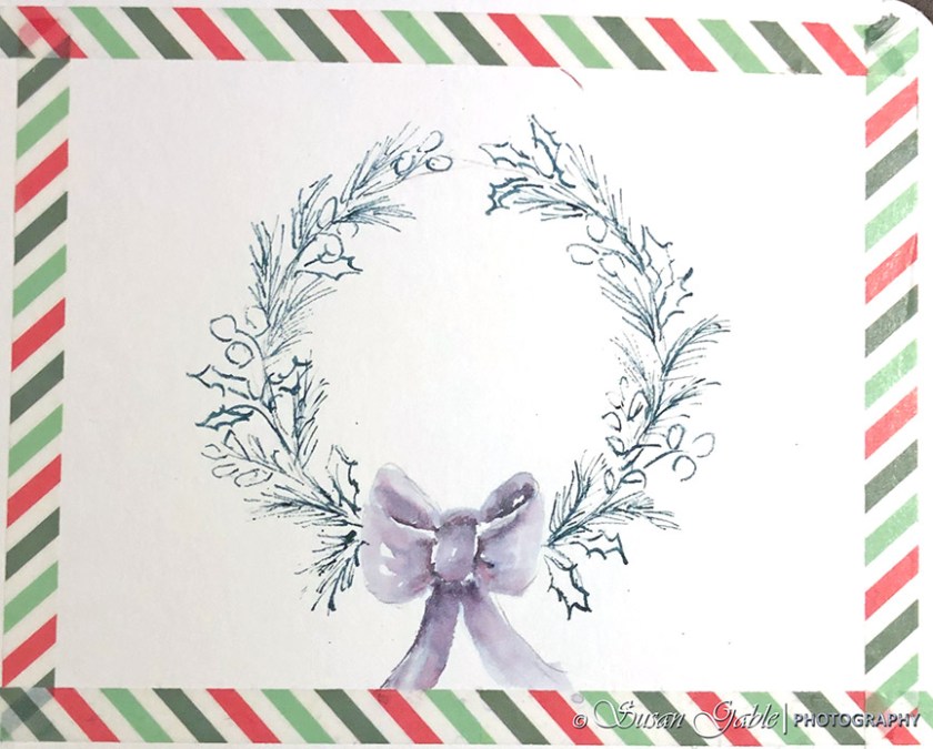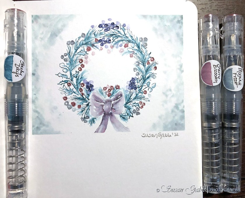 I mentioned in my previous watercolor blog post that I wanted to create a pen & ink wash wreath, but did not have the right colors in my five (5) artsy fountain pens. I decided this morning to “just do it” and see what happens.