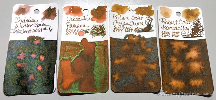 Ink swatches: Diamine Red Inkvent Winter Spice (shimmer/sheen). Vinta Inks Pamana. Robert Oster Caffe Crema and Kansas City.