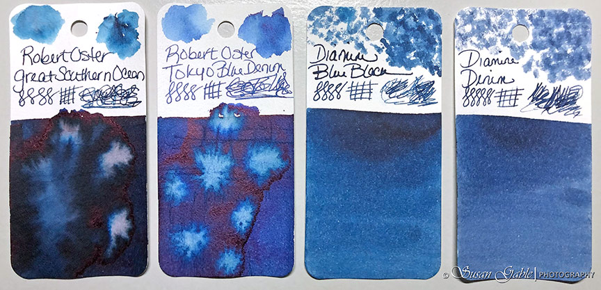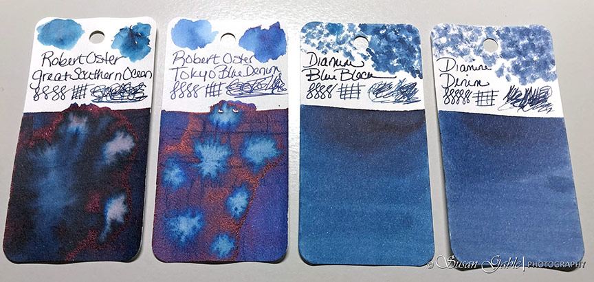 Ink swatches: Robert Oster Great Southern Ocean and Tokyo Blue Denim. Diamine Blue Black and Denim.