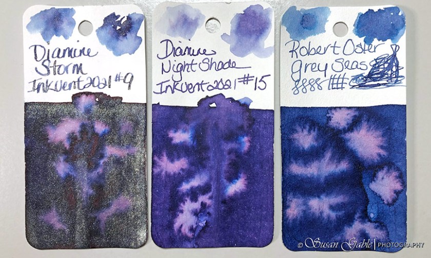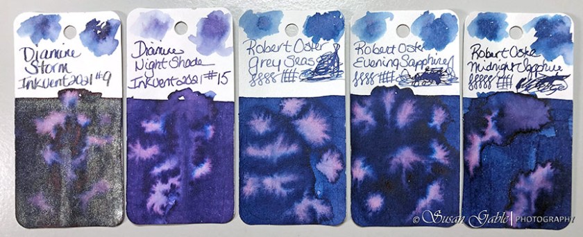 Ink swatches: Diamine Red Inkvent Storm (shimmers) and Night Shade. Robert Oster Grey Seas, Evening Sapphire, and Midnight Sapphire.
